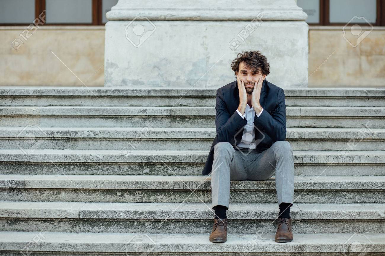 Handsome Man Sitting Outside Concerned On The Stairs Waiting For Someone Or Something Stock Photo Picture And Royalty Free Image Image 75448474